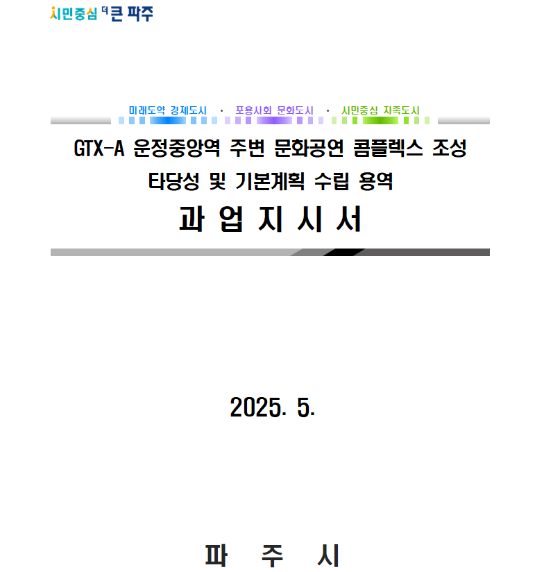 GTX 특별계획구역내 문2용지(현재 임시주차장 사용중)에 제대로된 문화공연장 건립 요청에 있어 파주시장님은 현재 파주시에서 GTX 문화공연장 건립을 위해 기본계획 수립용역을 착수한 상황으로 이미 복합문화공연장 건립을 위한 화살이 당겨진 상황으로 건립비 약 1,200억원을 투입하여 적극 추진하겠다고 답변하셨습니다.