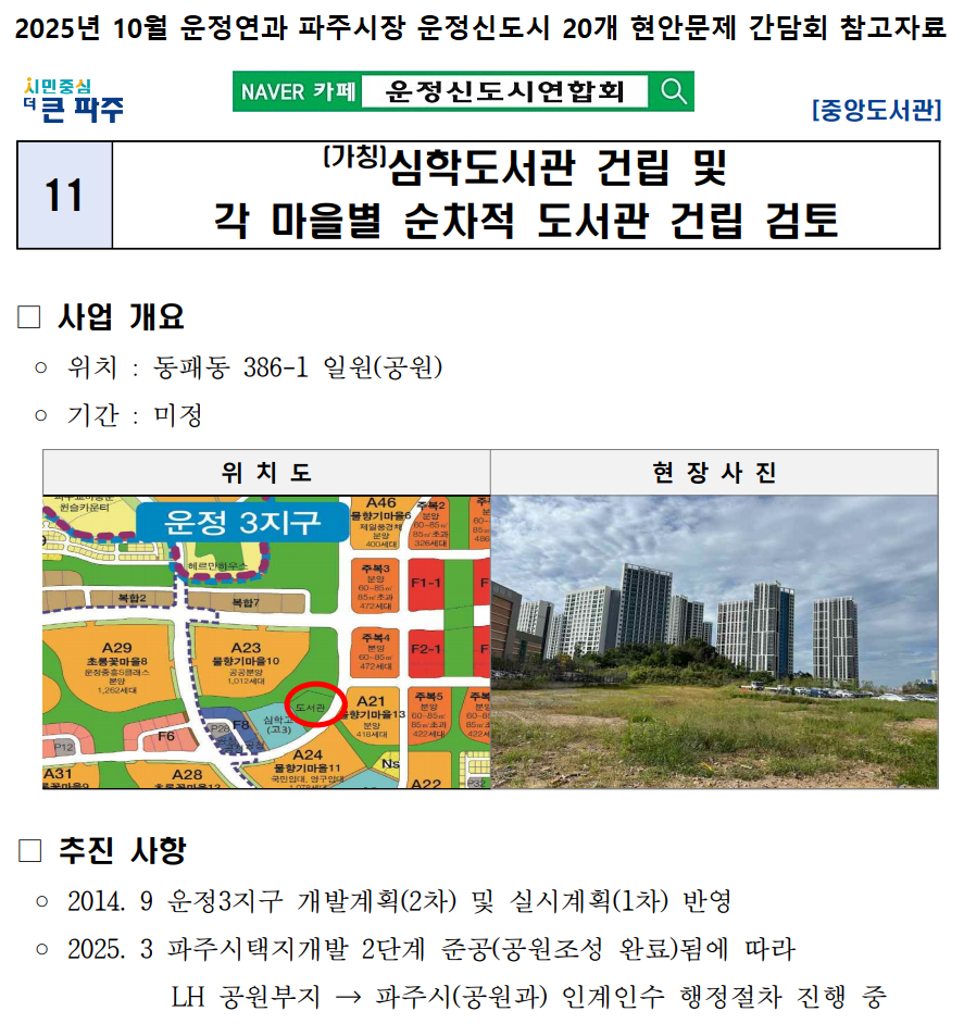 1. 운정6동 심학도서관 조속한 건립계획 수립 요청(금일 공통된 의견과 집중 건의 내용)