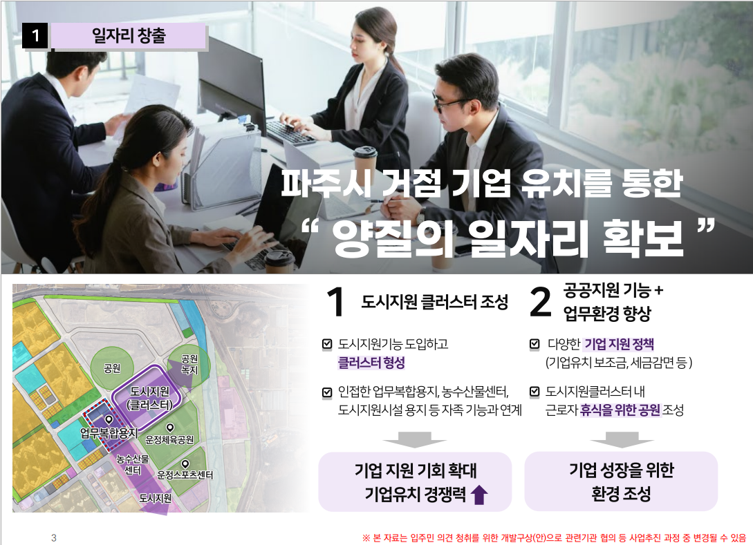 파주시는 운정신도시 3지구 유보지내 도시첨단산업단지를 단순 업무지구가 아닌 첨단기업이 선호하는 특화된 산업, 고용, 거점으로 개발하여 양질의 일자리를 창출한다는 방침입니다.