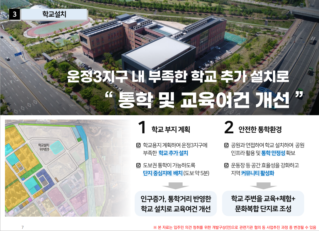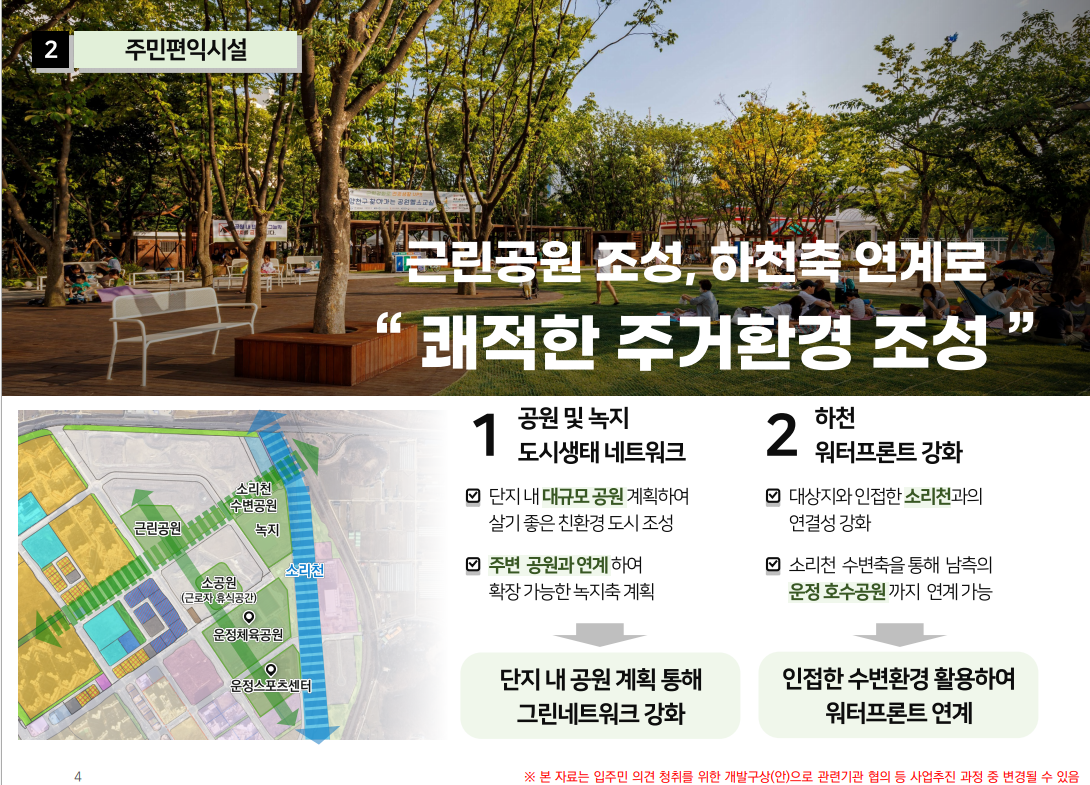 과밀학급 해소를 위한 초,중 통합 학교용지, 샤워실, 탈의실, 주차장등 규모를 갖춘 물놀이시설, 운동장 트랙(중소형급 예상), 도서관(공원) 중복지정 용지, 소리천 연계 산책길 조성등 일부 위치 조정은 있겠지만 LH에서 90% 이상 반영할 예정입니다.