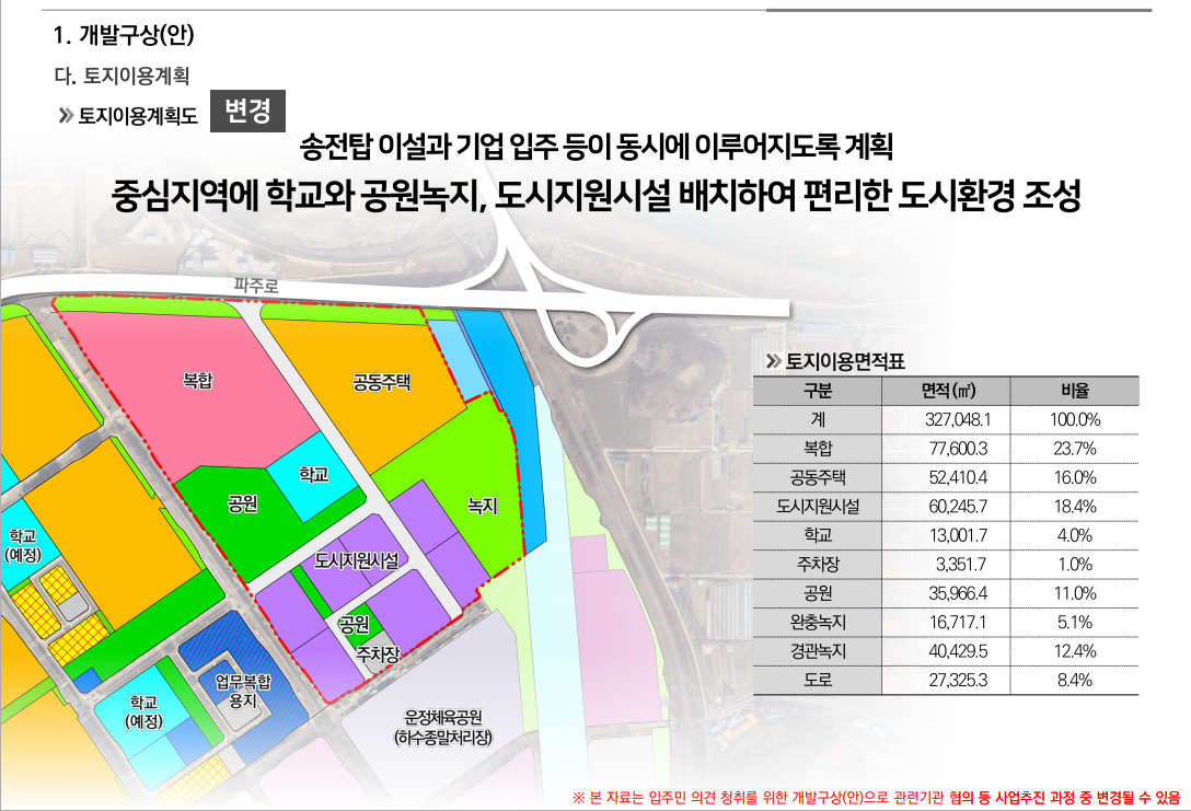 운정신도시의 자족기능 강화를 위한 유보지 내 약 9만 제곱미터의 도시첨단산업단지 추진은 2026년부터 파주시와 LH가 협업하여 기업유치에 적극 나선다는 계획으로 이번 파주시와 LH의 협약체결 보도자료는 운정신도시 유보지에 조성원가 이하의 싼 값에 토지가 공급되고 용적율 상향 인센티브, 취득세, 재산세 감면등 각종 세제혜택이 있는 도시첨단산업단지가 조성될 예정이니 기업들이 관심을 갖고 입주의향서를 미리 준비할수 있도록 하는 홍보차원의 목적도 있습니다.