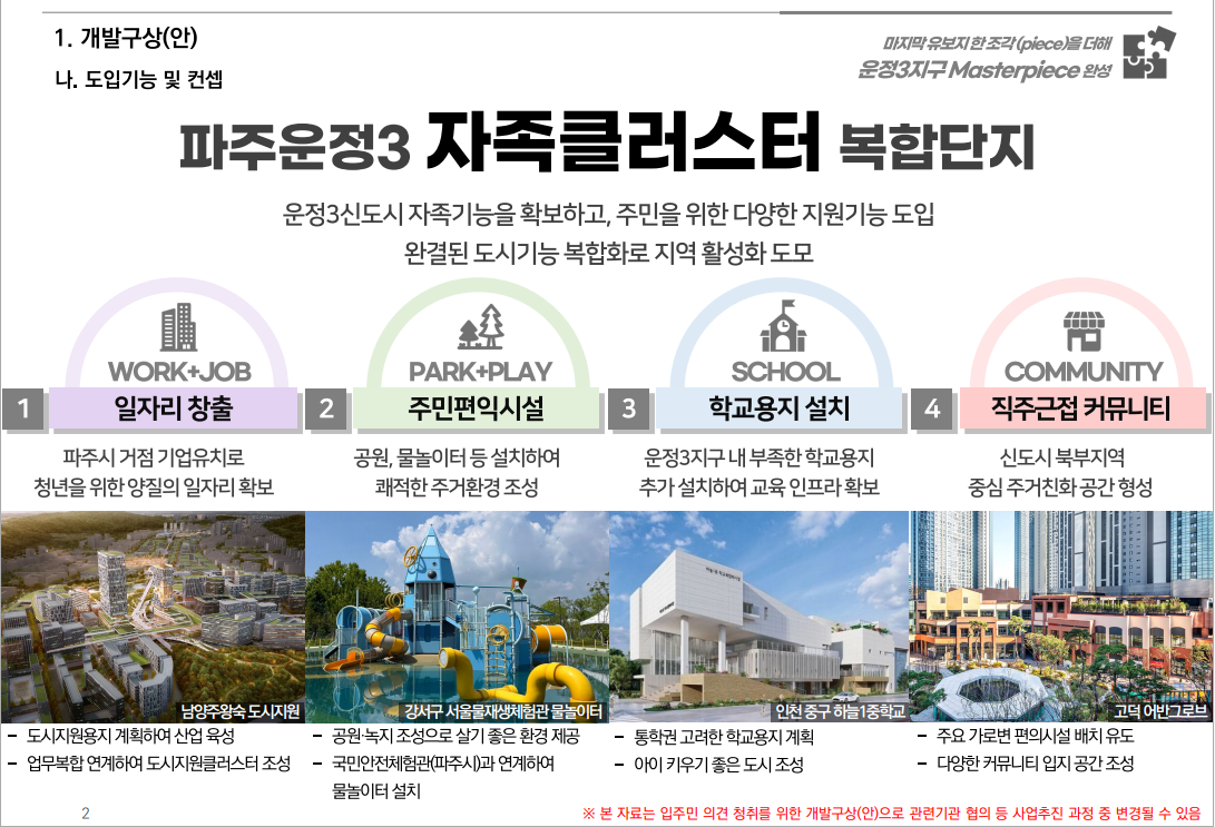 지난 12월 19일 파주시와 LH의 운정신도시 3지구 별하람마을 유보지 개발구상 방안에 있어 그동안 파주시와 LH간 적극 협의하였던 도시첨단산업단지(도시지역에 첨단산업을 집적하기 위해 지정된 산업단지) 조성 추진을 위한 양해각서(MOU)가 체결되었다는 좋은 소식 전해드립니다.