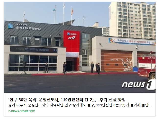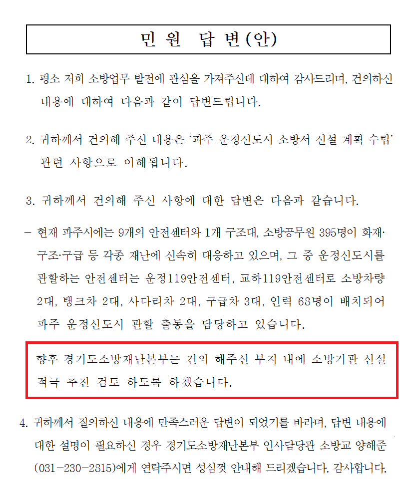 다행히도 최근 경기도소방재난본부에서 필지를 분할하지 않고 운정신도시 소방서 부지 전체를 부지매입 계약 체결하여 119안전센터의 업무를 포함한 경기도북부 119특수대응단을 건립하는 계획이 확정된 상황입니다.