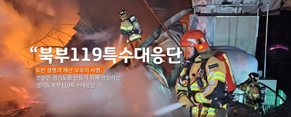 4. 경기도북부 119특수대응단은 차량 18대(구조공작 1대, 구조버스1대, 장비운반 1대, 도시탐색 1대, 구조견운반 1대, 회복지원버스 1대, 행정차 1대, 초고압방수차 1대, 내폭고성능화학차 1대, 기타 소방차량 9대등)을 보유하여 산업단지 및 고층건물 대형화재, 특수재난 발생시 국민의 생명과 재산을 보호하기 위해 구조대원으로 편성된 조직입니다.