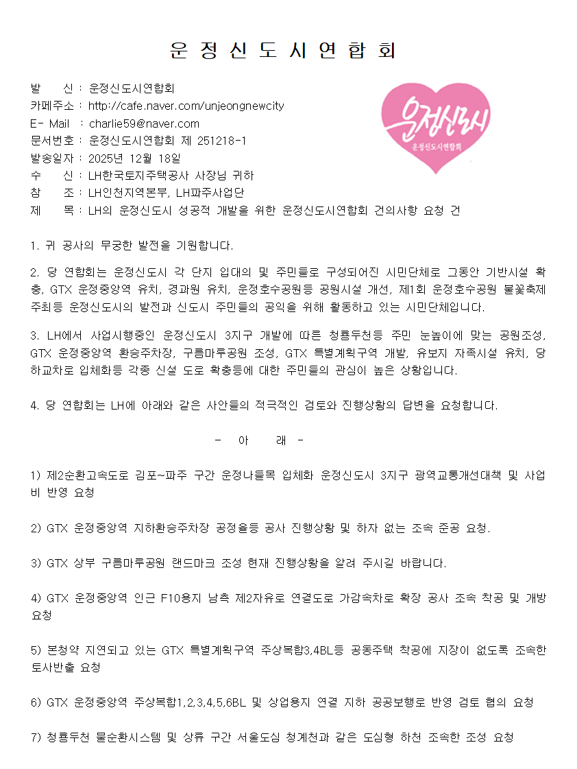 지난 2025년 5월에 이어 올 하반기 12월 그동안 4만 1천여명의 회원분들이 있는 운정연 카페를 통해 운정연 회원분들 비롯한 운정신도시 3지구등 각 마을별 대표분들이 LH의 운정신도시 3지구등 개발사업에 있어 문제점을 제기하고 건의하신 내용들과 신도시 주요 현안문제들을 금일 운정연에서 다시한번 정리하여 LH파주사업본부 박철인 본부장께 전달하였고 LH에서 운정신도시 주민분들의 건의사항을 적극 검토하여 반영시켜 줄 것을 요청하였습니다.